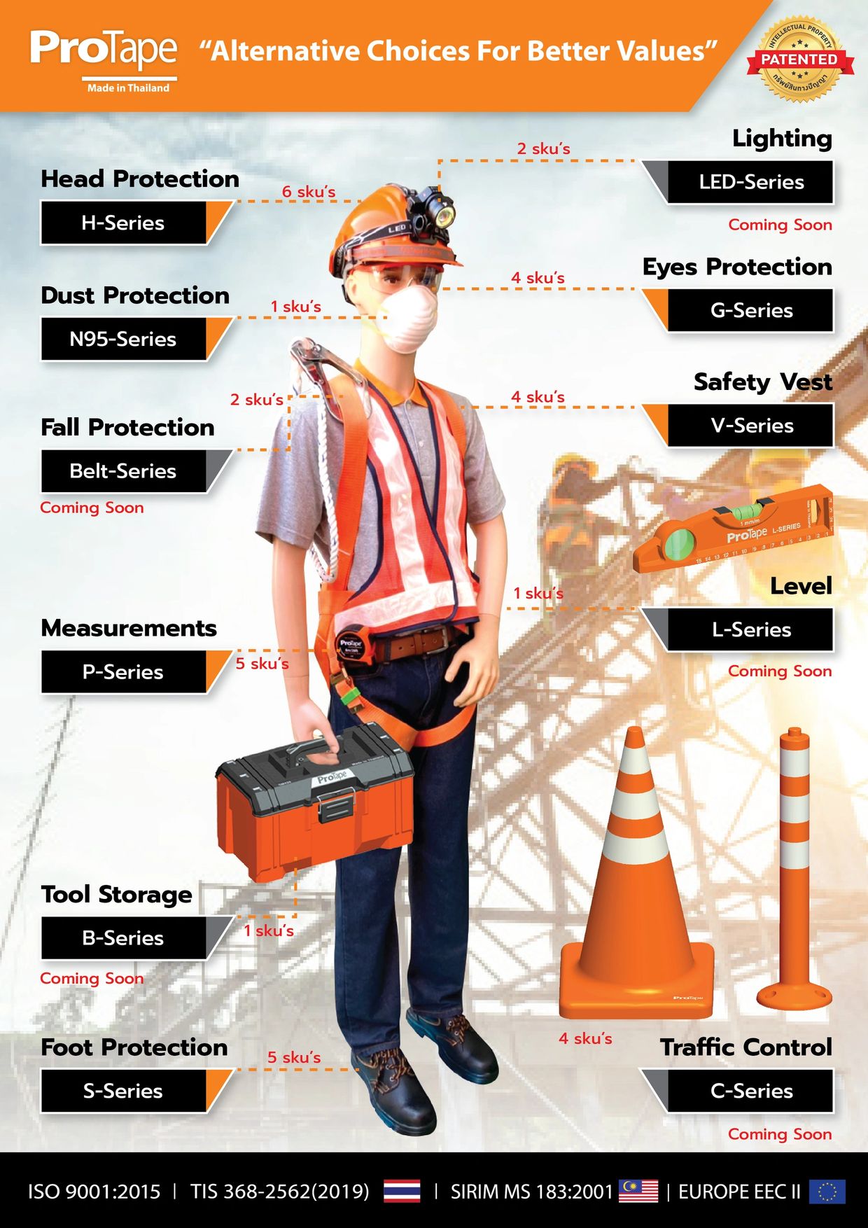 Professional Safety Tools since 2010, certified EUROPE EECII accuracy, Thailand Industrial TIS 368-2562(2019), Malaysia Industrial MS 183:2001, and ISO 9001:2015 to support personnel protection at construction sites in ASEAN.